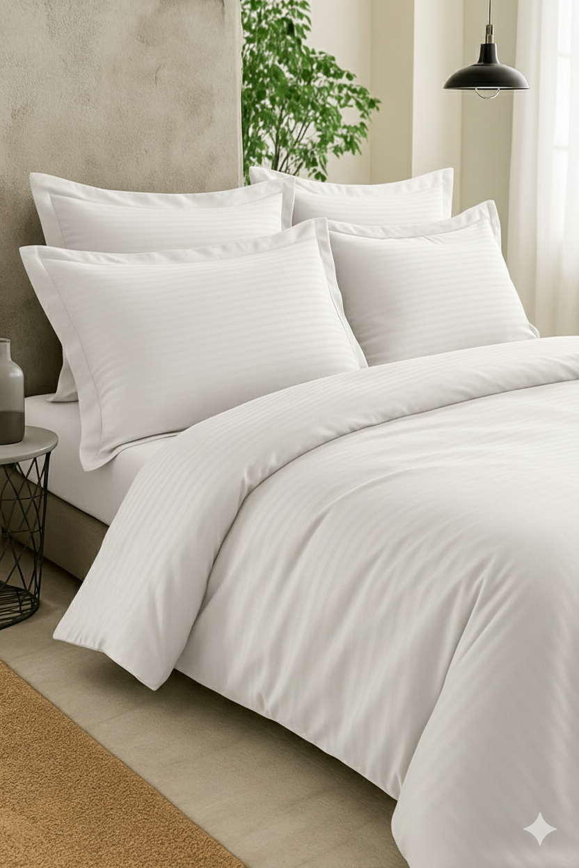 Découvrez le plaisir du grand luxe avec cette parure de lit en coton damassé légèrement satiné, le même tissu à rayures fines que l’on retrouve dans les hôtels 5 étoiles du monde entier. Son tissage subtil capte la lumière avec élégance, créant un effet soyeux et raffiné tout en préservant la douceur et la respirabilité du coton naturel. Confortable, chic et intemporelle, cette parure transforme chaque nuit en une expérience digne des plus belles suites d’hôtel. Une touche de luxe discret pour un sommeil paisible et une chambre élégante au quotidien.