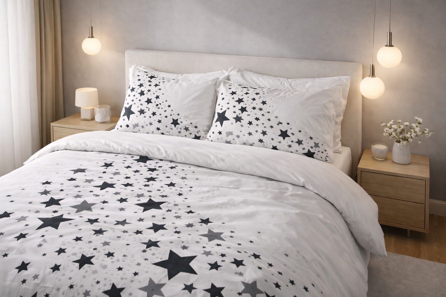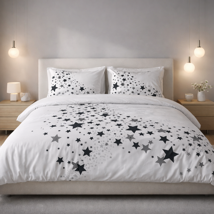 Les motifs s’inspirent d’un univers étoilé doux et apaisant, jouant sur des contrastes subtils et des formes harmonieuses.
