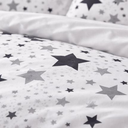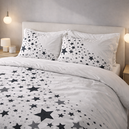 Cette parure de lit comprend une housse de couette et deux taies d’oreiller assorties, confectionnées en polycoton renforcé, avec un tissage dense de 78 fils/cm².