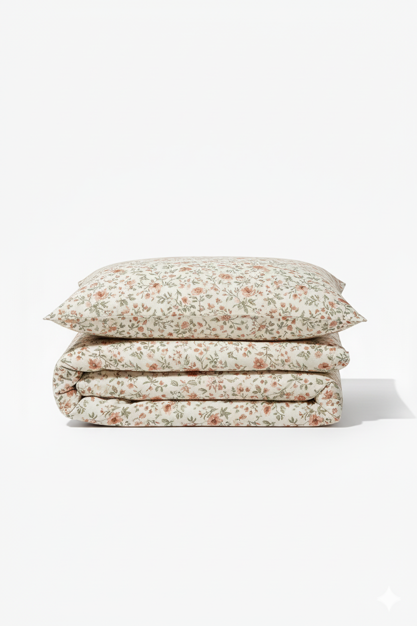 Les motifs floraux, discrets et inspirés de la nature, apportent une note poétique à l’ensemble, sans jamais surcharger. L’aspect mat de la percale révèle la finesse des lignes et crée une ambiance apaisante, douce à l’œil comme au toucher.